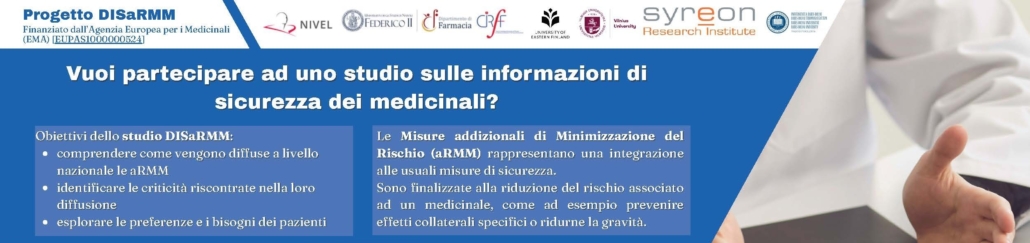 DISaRMM è uno studio internazionale che analizza come vengono diffuse ai professionisti sanitari e ai pazienti le misure aggiuntive di minimizzazione del rischio (aRMM) dei medicinali (es. guide per gli operatori sanitari, schede paziente, materiali educativi) e quali criticità incontrano gli attori coinvolti nel processo. I risultati contribuiranno a migliorare la qualità e l’efficacia della comunicazione sui rischi dei medicinali in Europa.